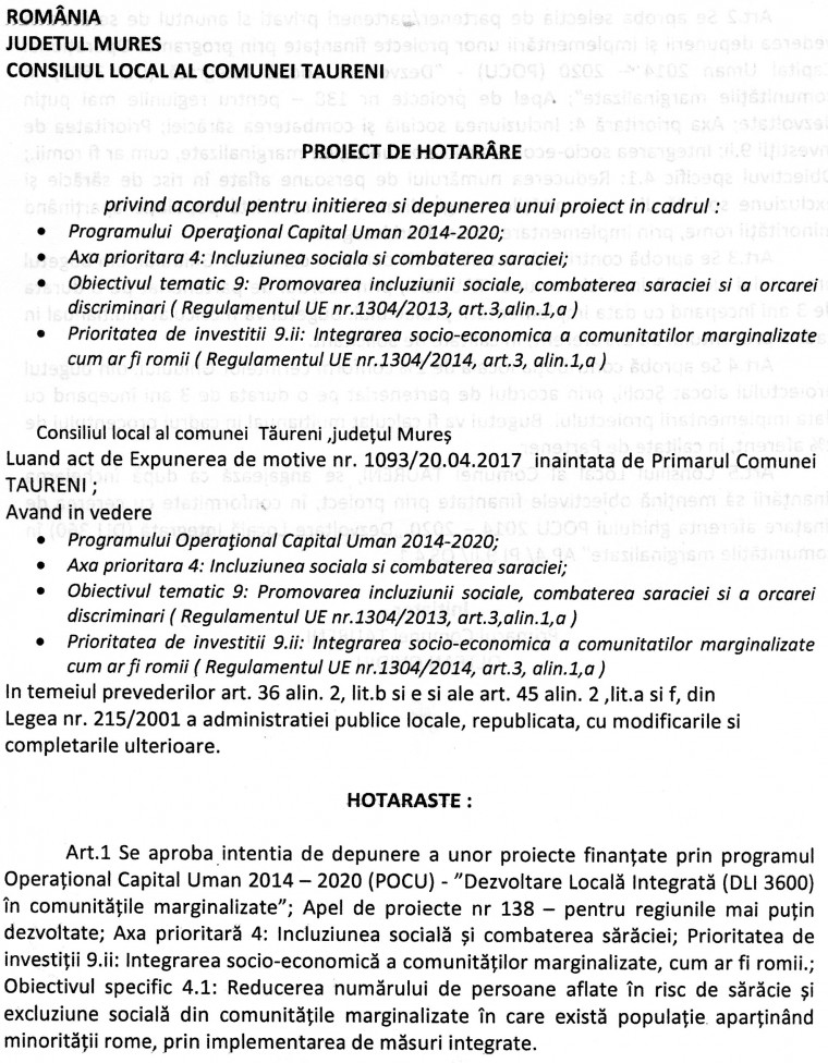 Proiect de Hotarare privind acordul pentru inițierea și depunerea unui proiect în cadrul Prog.Oper.Cap.Uman 2014-2020